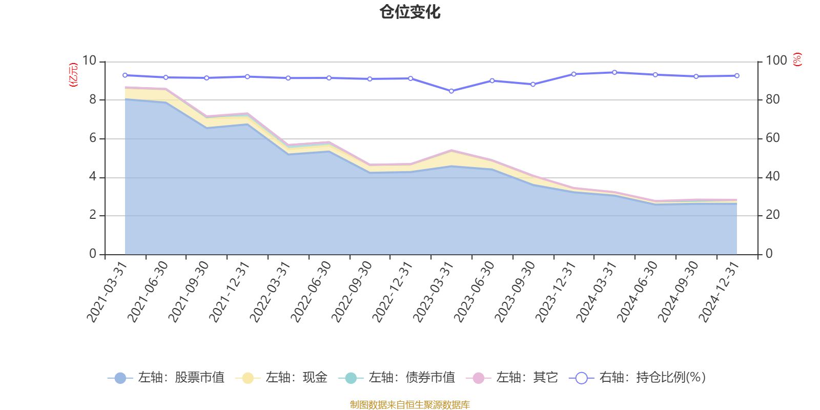 据定期报告数据统计,近三年平均股票仓位为91.16%,同类平均为84.97%。2024年一季度末基金达到94.38%的最高仓位,2023年一季度末最低,为84.68%。